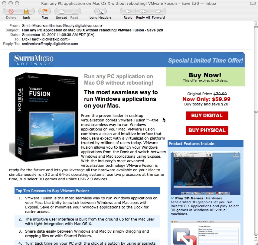 Today I got an email from Smith Micro about VM Fusion. I have never dealt with Smith Micro, no real idea who they are. At the bottom of the email I noticed that the email had been forwarded by Sxipper.
